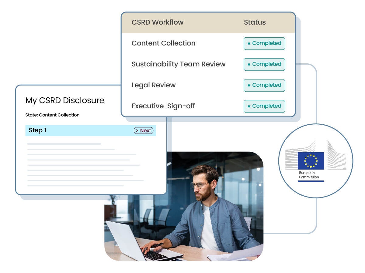 An ESG Disclosure module offering a single workspace for CSRD reporting, including features for tracking progress, assigning requirements, authoring answers and utilizing your data for detailed and auditable traceability. Learn more